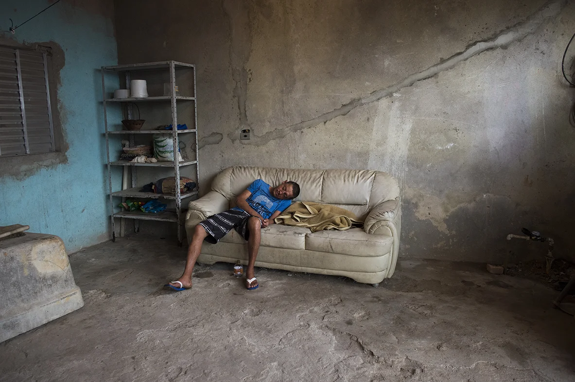 An unnamed alcoholic sleeps after passing out in his home in São Bernardo favela, São Paulo, on August 9, 2016. His mother, unseen, explains that his facial scars and bruises were as a result of falling in the shower while drunk.