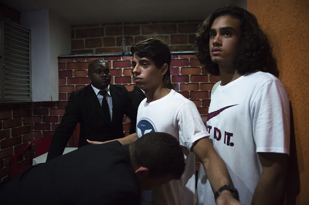 Teens get checked by bouncers at entry at a Baile funk party venue in Rio das Pedras, Rio, on August 19, 2016.